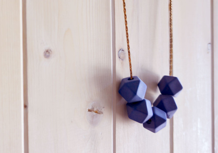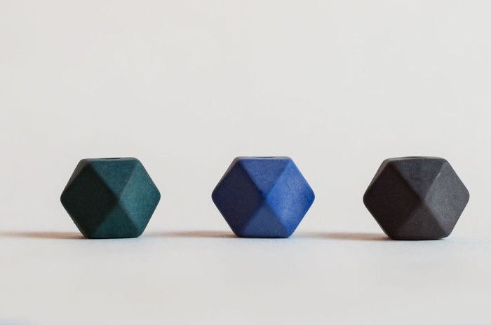 Five geometric cuboctahedron beads with a matte, cobalt blue finish rest along the end a mid-century brass chain to form a bold, geometric catenary. These beads have an amazing weight and a velvety sandstone-like texture.